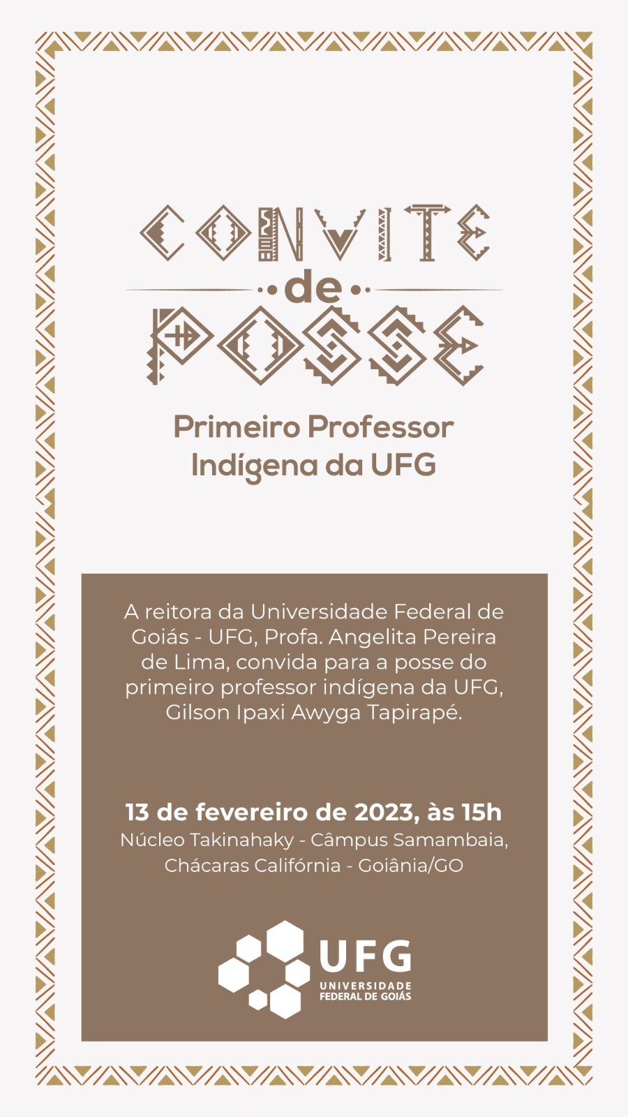 Convite para Cerimônia de Posse do Primeiro Professor Indígena da UFG Event Local: Núcleo Takinahaky - Câmpus Samambaia - UFG Event date : February 13, 2023 at 15:00 TweetWhatsApp List all Back