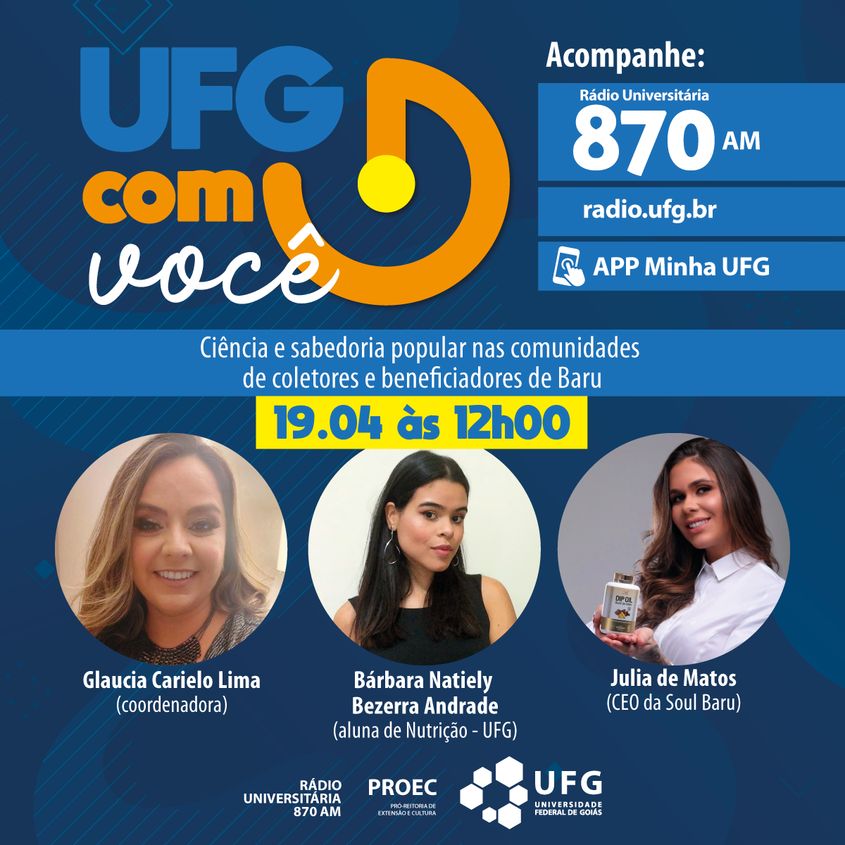 UFG com você - Ciência e sabedoria popular nas comunidades de coletores e beneficiadores de Baru Evento Local: Rádio Universitária 870 AM Data evento : 19 aprile 2023 alle 12:00 TweetWhatsApp Elenca tutto Volver
