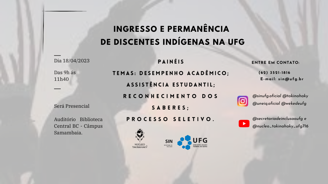 No dia 18 de abril de 2023, das 9h às 11h40 (horário de Brasília), haverá uma cerimônia intitulada “Ingresso e permanência de discentes indígenas na UFG” a realizar-se no Auditório da Biblioteca Central - BC/UFG (o evento será presencial). Convidamos toda a comunidade acadêmica para participar e contribuir com as temáticas que serão apresentadas em forma de painéis.