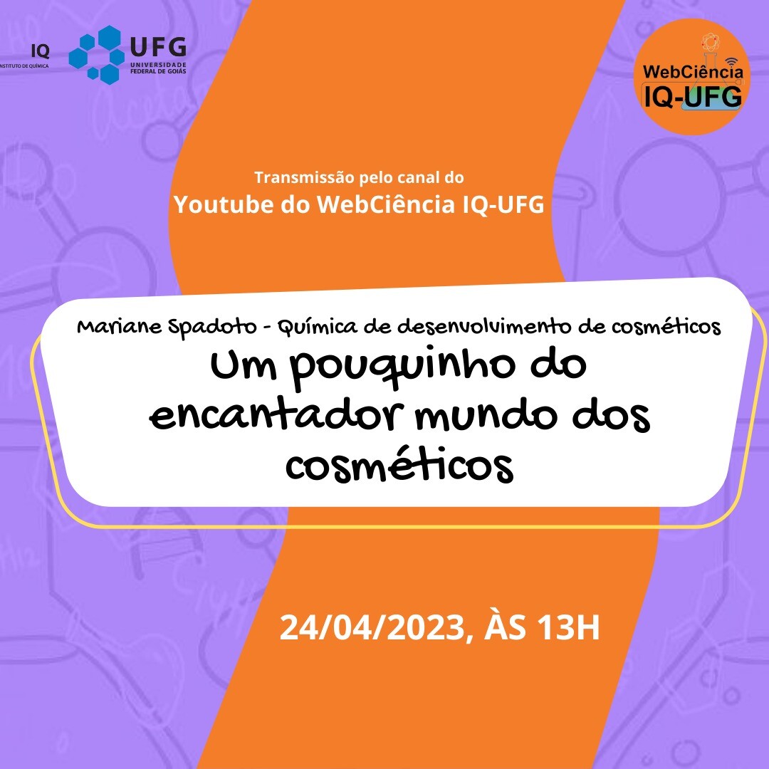 Webnário "Um pouquinho do encantador mundo dos cosméticos" Event Local: Youtube do WebCiência IQ-UFG Event date : April 24, 2023 at 13:00 TweetWhatsApp List all Back
