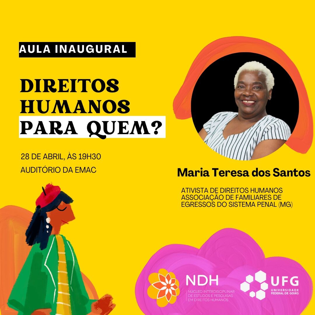 19:30h – Abertura do ano letivo do Núcleo e do Programa de Pós em Direitos Humanos e palestra com Maria Teresa dos Santos: “Direitos Humanos para quem?”