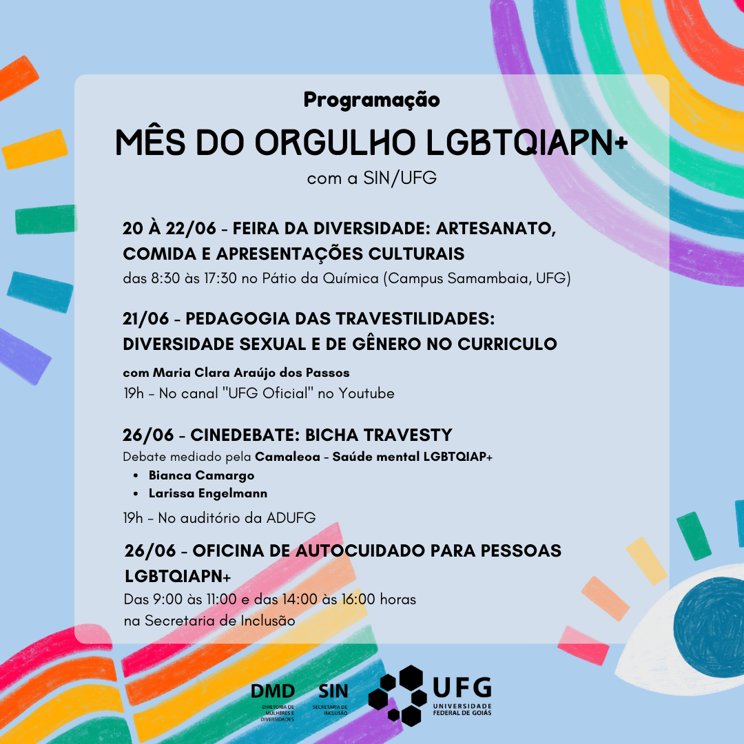 Programação de 26 de junho do "Mês do Orgulho LGBTQIAPN+ " Event Local: Secretaria de Inclusão (SIN) / Auditório da Adufg Event period : June 20 - 26, 2023 TweetWhatsApp List all Back