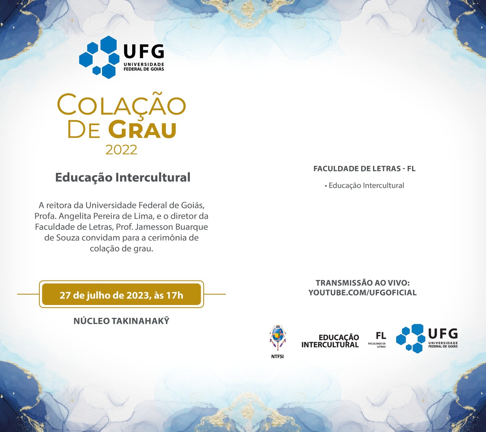 Colação de grau 2022 - Educação Intercultural Evento Local: Núcleo Takinahakỹ, Câmpus Samambaia Data evento : 27 luglio 2023 alle 17:00 TweetWhatsApp Elenca tutto Volver