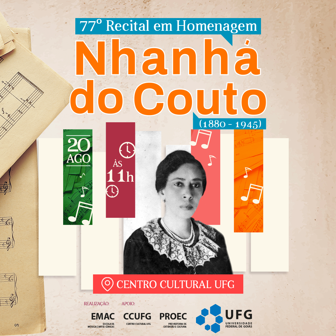 No dia 20 de agosto de 2023, domingo, 11h, acontece no Centro Cultural UFG o 77° Recital em Homenagem à Nhanhá do Couto. Em formato presencial e entrada franca, o evento contará com apresentação de professores de música e Coro de Câmara da EMAC.
