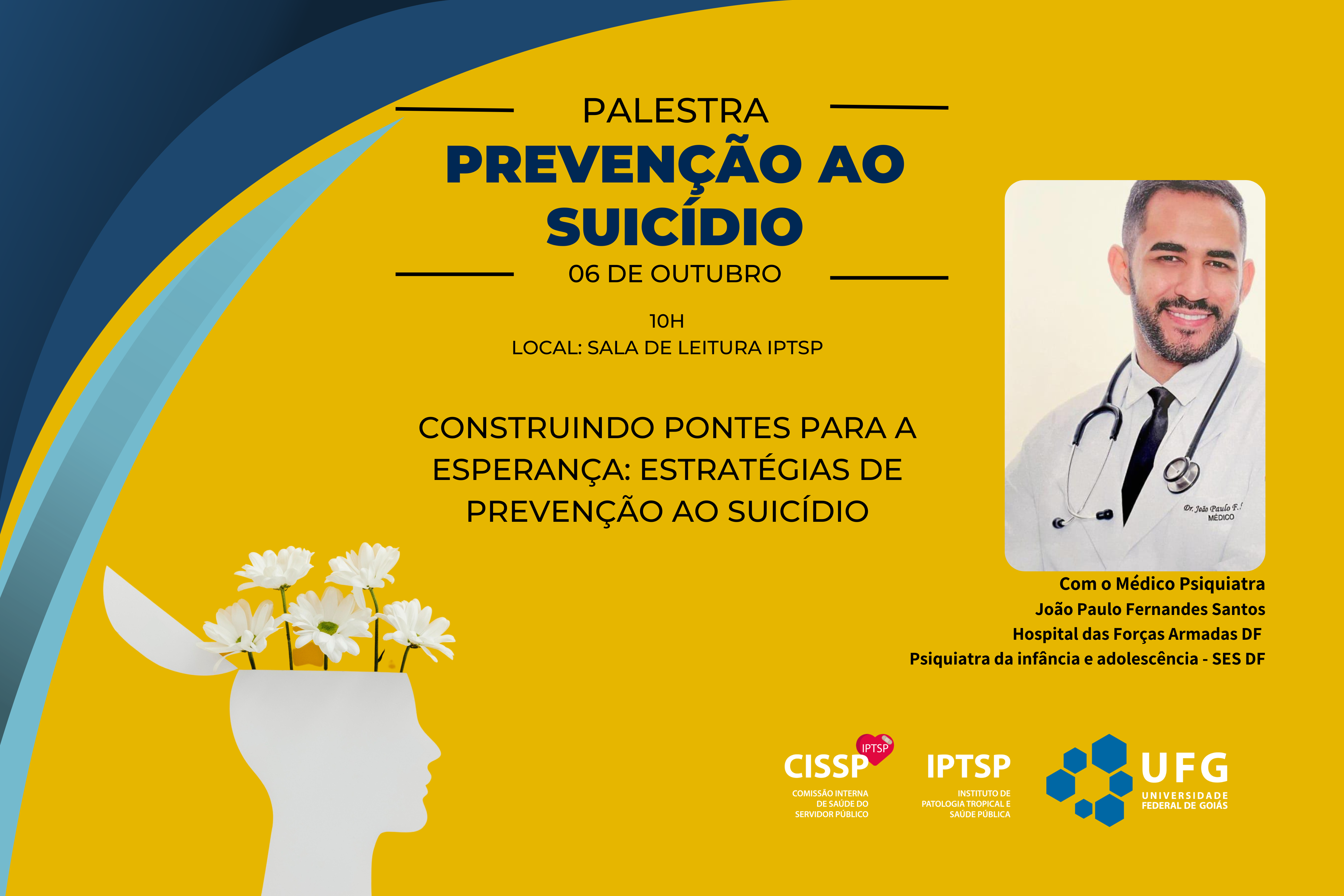 No próximo dia 06 de outubro, às 10h, o Instituto de Patologia Tropical e Saúde Pública (IPTSP) sediará uma palestra de extrema importância sobre prevenção do suicídio. Intitulada "Construindo Pontes para a Esperança: Estratégias de Prevenção ao Suicídio", o evento contará com a presença do Médico Psiquiatra, João Paulo Fernandes Santos.