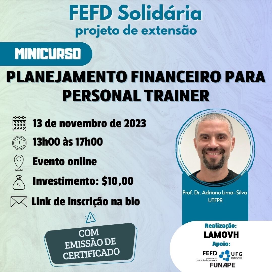 No dia 13 de novembro, das 13 às 17 horas, ocorrerá a palestra " Planejamento financeiro para personal trainer ", ministrada de forma on-ine pelo professor Adriano Eduardo Lima-Silva, da Universidade Tecnológica Federal do Paraná. O evento faz parte do Projeto de Extensão "FEFD Solidária" da Faculdade de Educação Física e Dança da UFG. As inscrições são feitas on-line (https://forms.gle/vd4vvDNxRKJxJnod7) e a taxa de inscrição é de R$10,00 (que serão totalmente utilizados para comprar de alimentos a serem doados a uma entidade assistencial determinada por sorteio). Haverá emissão de certificado.