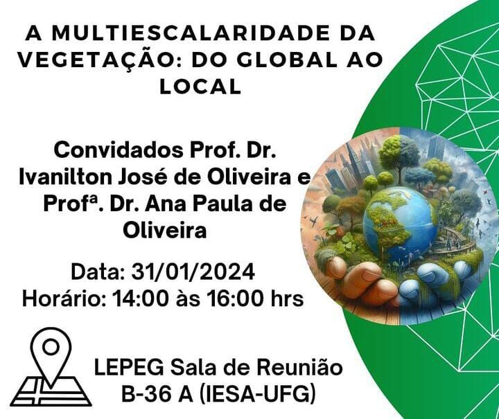 O Núcleo de Estudos e Pesquisas em Geografia, Ensino e Ambiente (NúcleoGea) promove no dia 31 de janeiro, às 14h, o minicurso A multiescalaridade da vegetação: do global ao local. O minicurso será realizado na Sala de Reuniões do Laboratório de Estudos e Pesquisas em Educação Geográfica, do Instituto de Estudos Socioambientais da Universidade Federal de Goiás (Iesa/UFG), no Câmpus Samambaia. Não é necessária inscrição prévia.