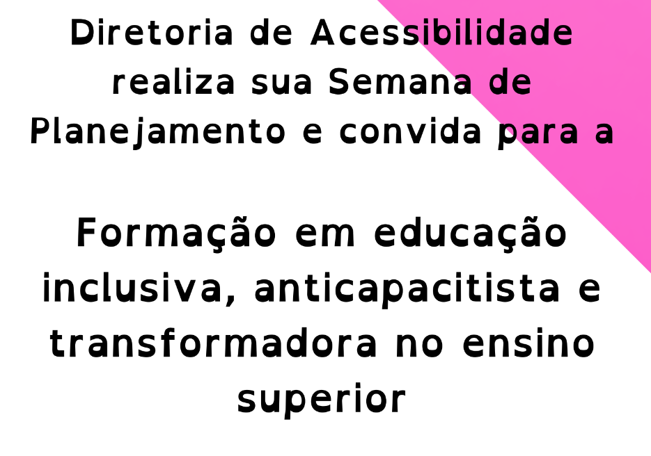 A Diretoria de Acessibilidade realiza sua semana de Planejamento Pedagógico 2024/1, com o evento Formação em educação inclusiva, anticapacitista  e transformadora no ensino superior. Parte da programação será aberta à toda comunidade. Com o compromisso de coadunar e viabilizar uma educação superior inclusiva e acessível para todas as pessoas, nos debruçarmos nos estudos das políticas de acessibilidade e suas interseccionalidades, com vistas à garantia dos direitos, autonomia e plena participação dos estudantes com deficiência. O evento é gratuito e terá certificado. As inscrições serão realizadas no local.