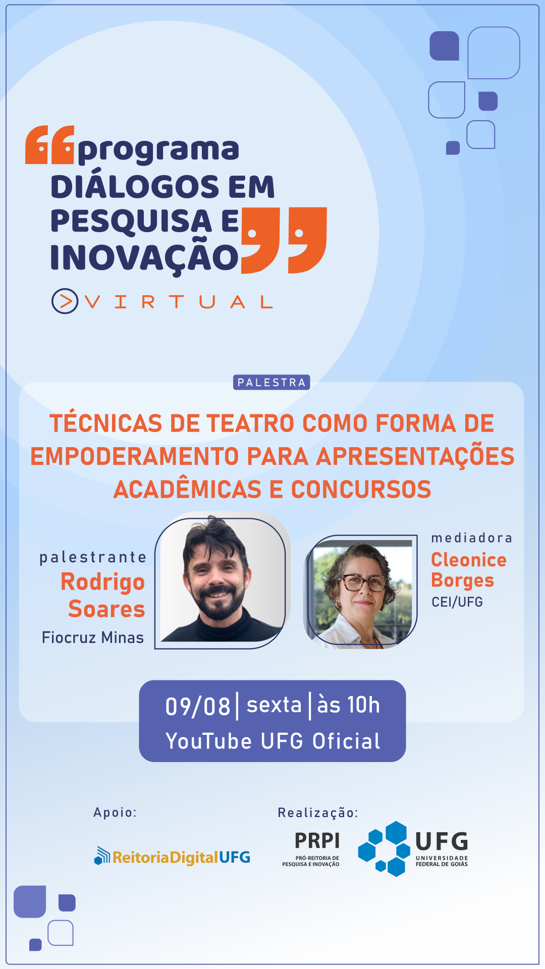 Palestra: "Técnicas de teatro como forma de empoderamento para apresentações acadêmicas e concursos" Evento Local: YouTube UFG Oficial Fecha del Evento : 09 Agosto 2024 a las 10:00 Inscreva-se aqui: https://dialogos.plateia.ufg.br/ TweetWhatsApp Todas las páginas Volver