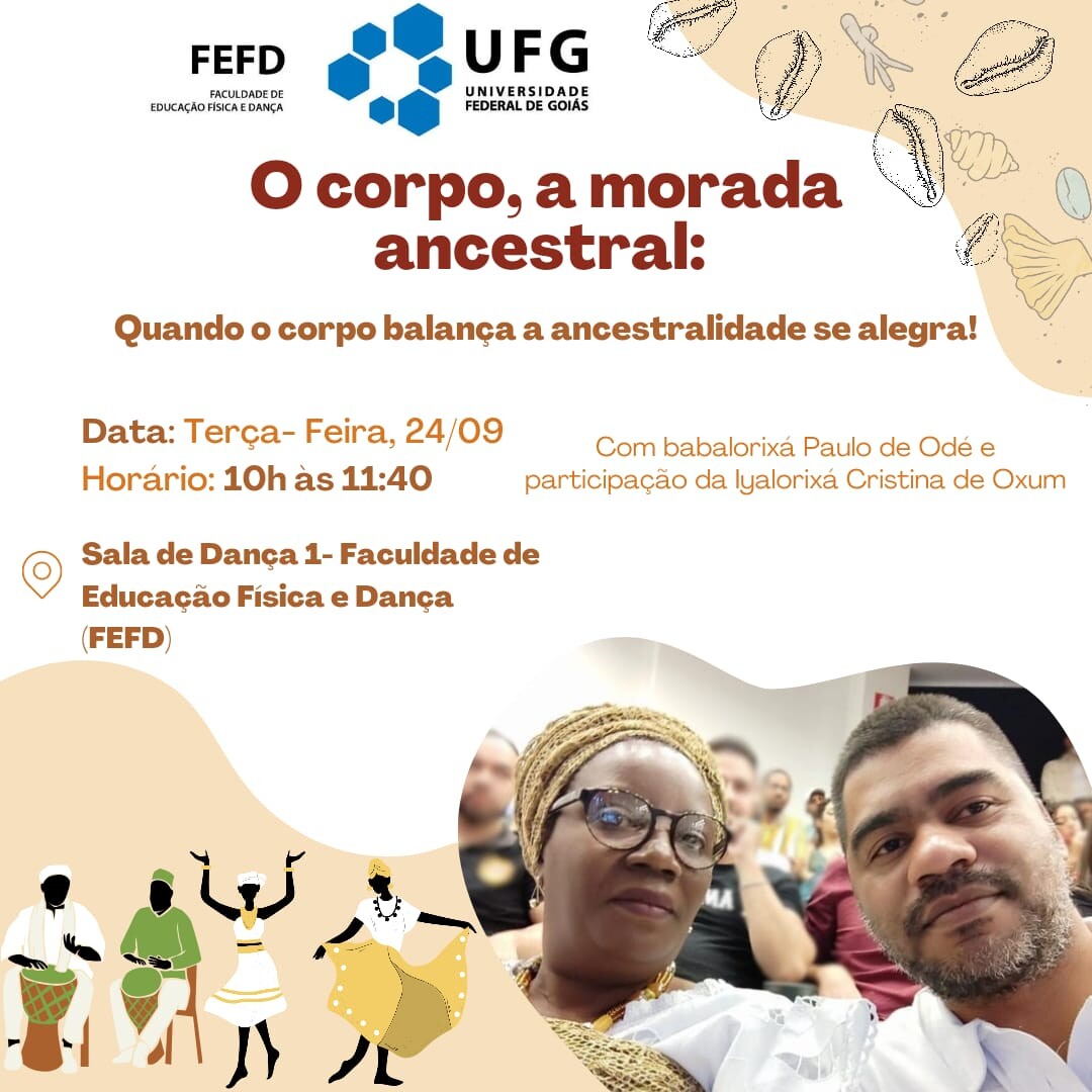 A disciplina de "Técnicas e Práticas em Dança: Poéticas Populares e Afro-Amerindias", da Faculdade de Educação Física e Dança (FEFD/UFG), vai realizar uma aula aberta com o Babalorixá Paulo de Odé e a Iyalorixá Cristina de Oxum na próxima terça-feira (24), na Sala de Dança 1 da FEFD.