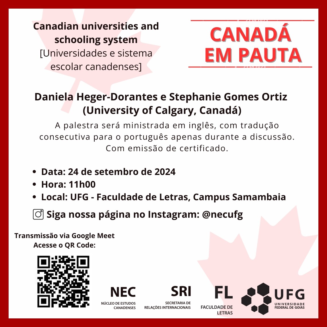 O Núcleo de Estudos Canadenses/UFG, sediado na Secretaria de Relações Internacionais (SRI), dentro da programação do Projeto de Extensão Canadá em pauta, convida para a seguinte palestra: Canadian universities and schooling system [Universidades e sistema escolar canadenses]