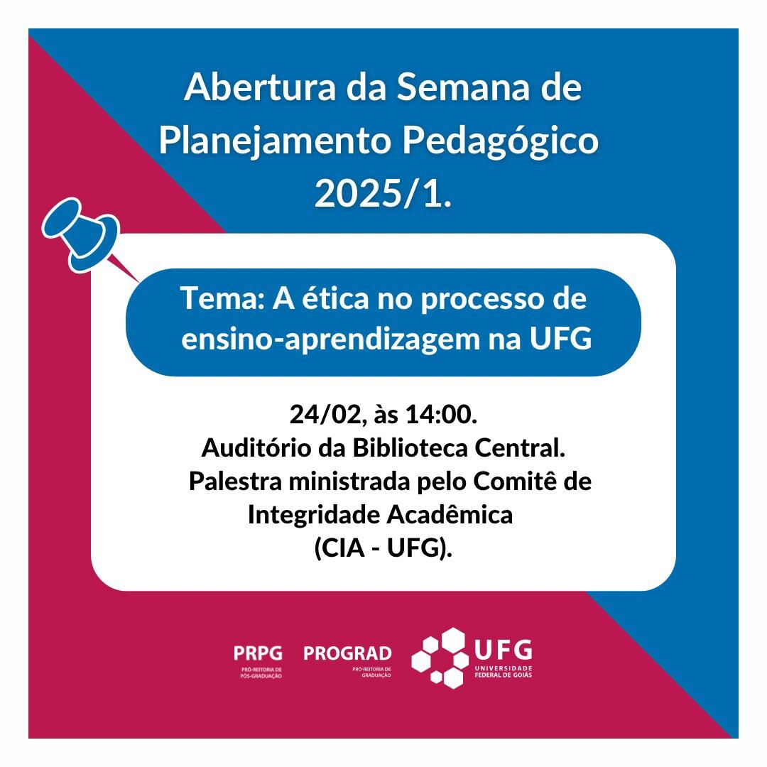 Abertura da Semana de Planejamento Pedagógico 2025/1 Evento Local: Auditório da Biblioteca Central da UFG, Câmpus Samambaia Data evento : 24 febbraio 2025 alle 14:00 TweetWhatsApp Elenca tutto Volver