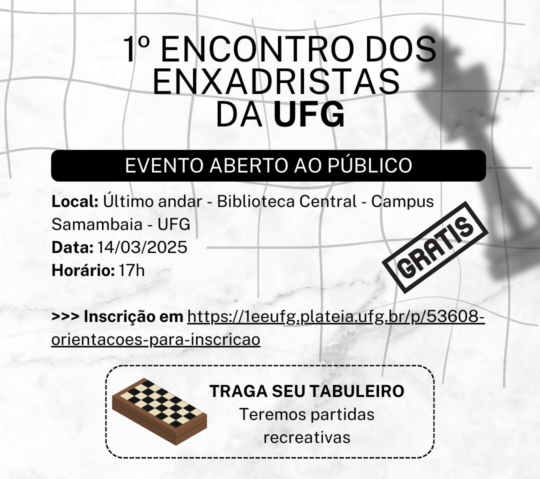 1º Encontro dos Enxadristas da UFG Event Local: Biblioteca Central da UFG, Câmpus Samambaia Event date : March 14, 2025 at 17:00 TweetWhatsApp List all Back