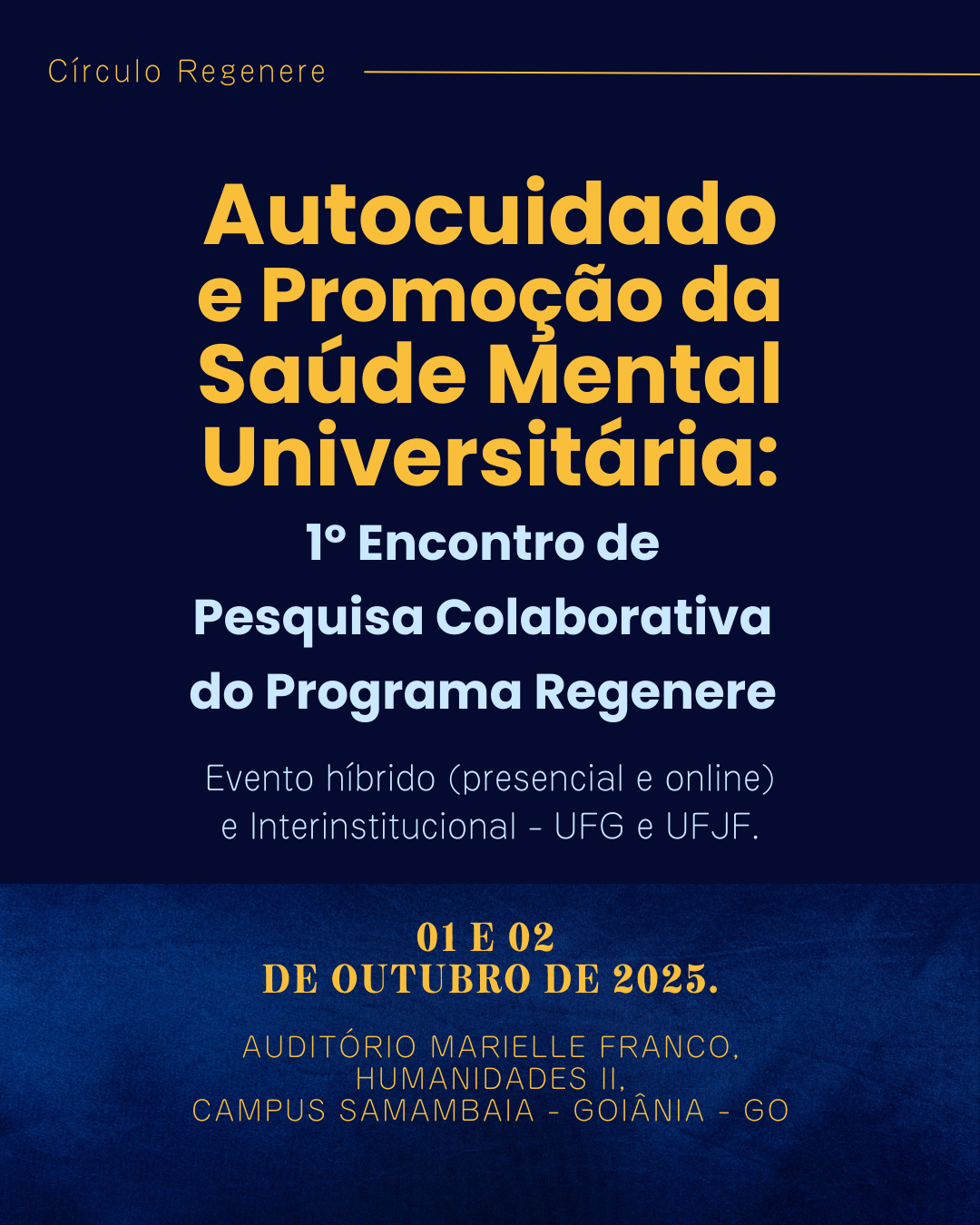 O “1º Encontro de Pesquisa Colaborativa do Programa Regenere” será um espaço dedicado à reflexão sobre a promoção da saúde mental universitária, a partir da prática do autocuidado consciente e na atenção às necessidades humanas básicas, enquanto estratégias de cuidado e resistência frente aos determinantes psicossociais do sofrimento.
