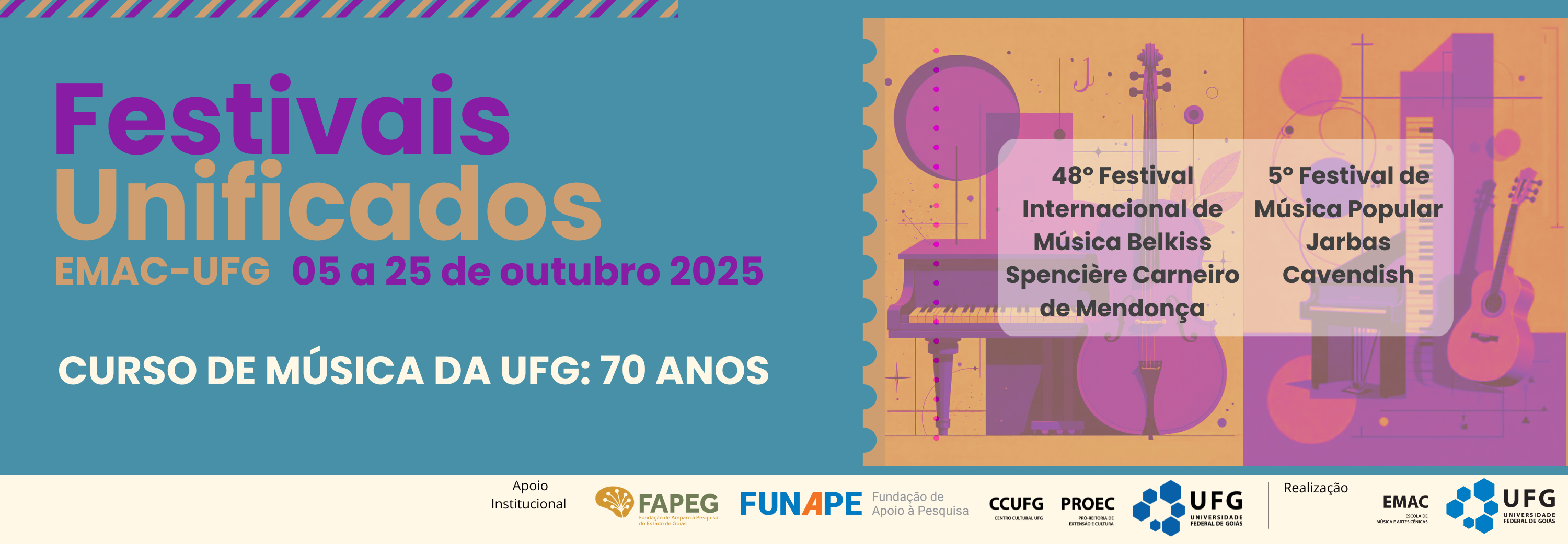 Dentre as iniciativas culturais promovidas pela instituição estão o 48º Festival Internacional de Música Belkiss S. Carneiro de Mendonça e  o 5º Festival de Música Popular Jarbas Cavendish. Os Festivais Unificados da EMAC-UFG em 2025 tem como mote “MÚSICA UFG 70 anos” e tem como escopo a recuperação da memória institucional e dar continuidade  Neste ano, iniciaremos as comemorações dos 70 anos da instituição a partir da participação de docentes, servidores, egressos e discentes que contribuíram para a consolidação dos festivais.
