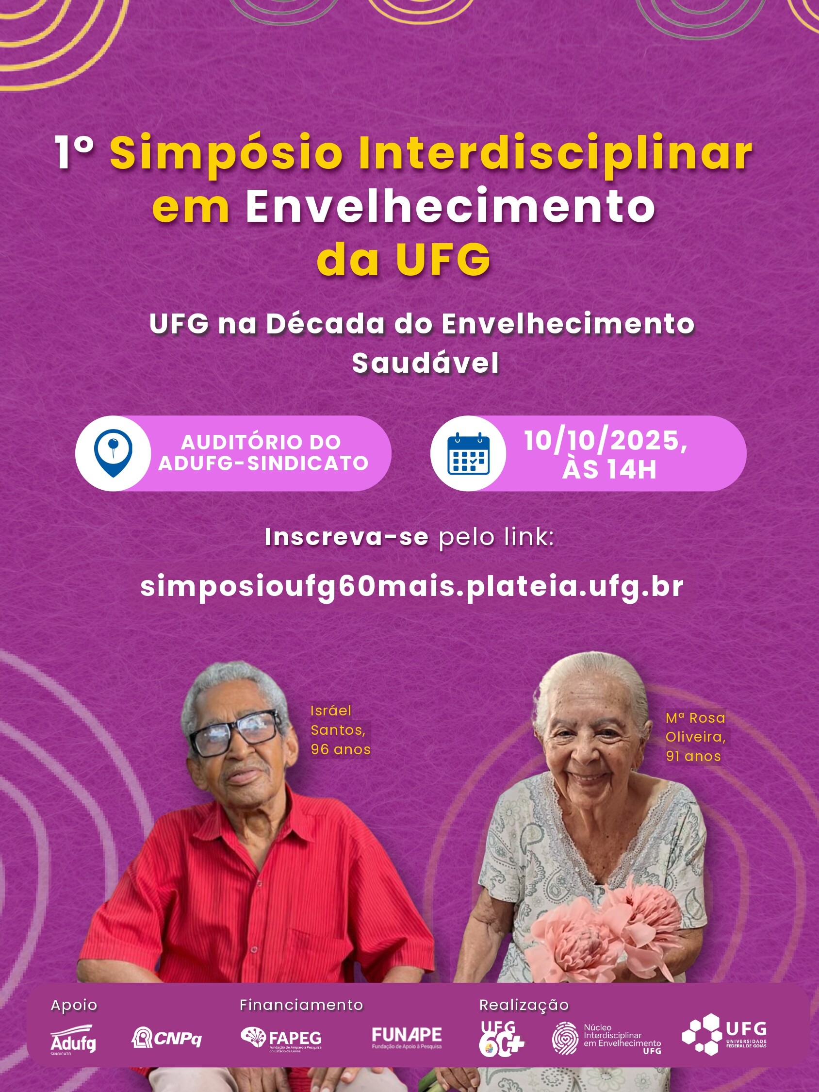 O Núcleo Interdisciplinar em Envelhecimento da Universidade Federal de Goiás (NIPEE UFG 60+), realiza no dia 10 de outubro, às 14 horas, o 1º Simpósio Interdisciplinar em Envelhecimento da UFG. O evento acontecerá no auditório da ADUFG e contará com o apoio da Fundação de Amparo à Pesquisa do Estado de Goiás (FAPEG).