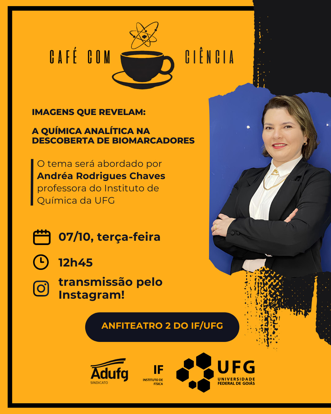 O Café com Ciência do Instituto de Física da UFG recebe, na próxima terça-feira (07/10), a Profª. Dra. Andréa Rodrigues Chaves (Instituto de Química/UFG) para uma palestra sobre o papel da química analítica na identificação e caracterização de biomarcadores.