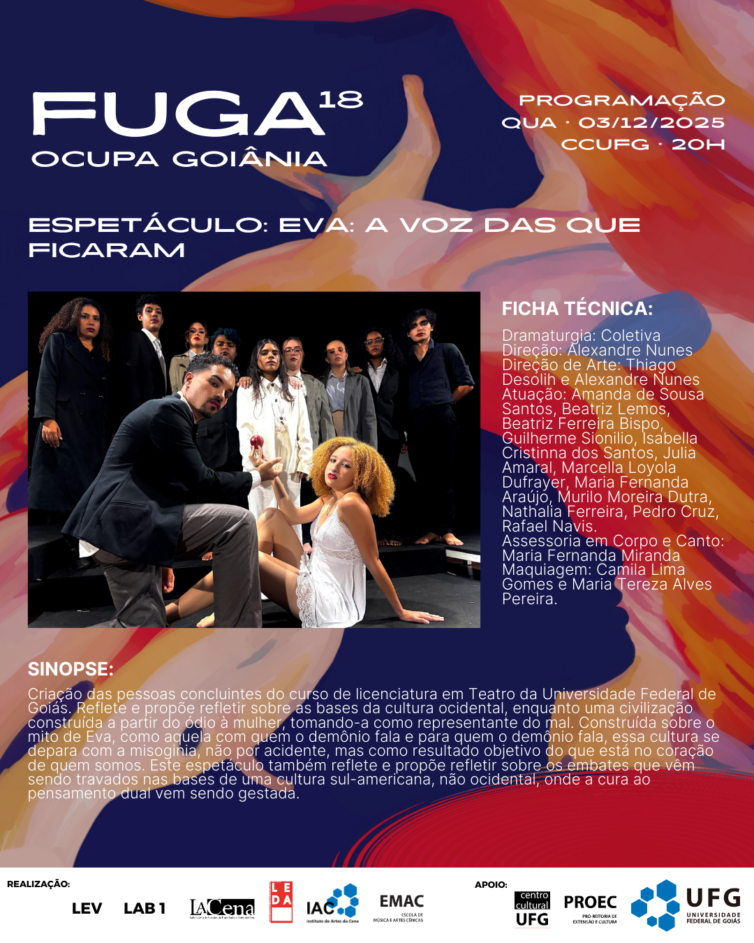 Mostra Fuga 18 Ocupa Goiânia - "Eva: a voz das que ficaram" Evento Local: Centro Cultural UFG Data do Evento : 03 de Dezembro 2025 às 20:00 TweetWhatsApp Listar Todas Voltar