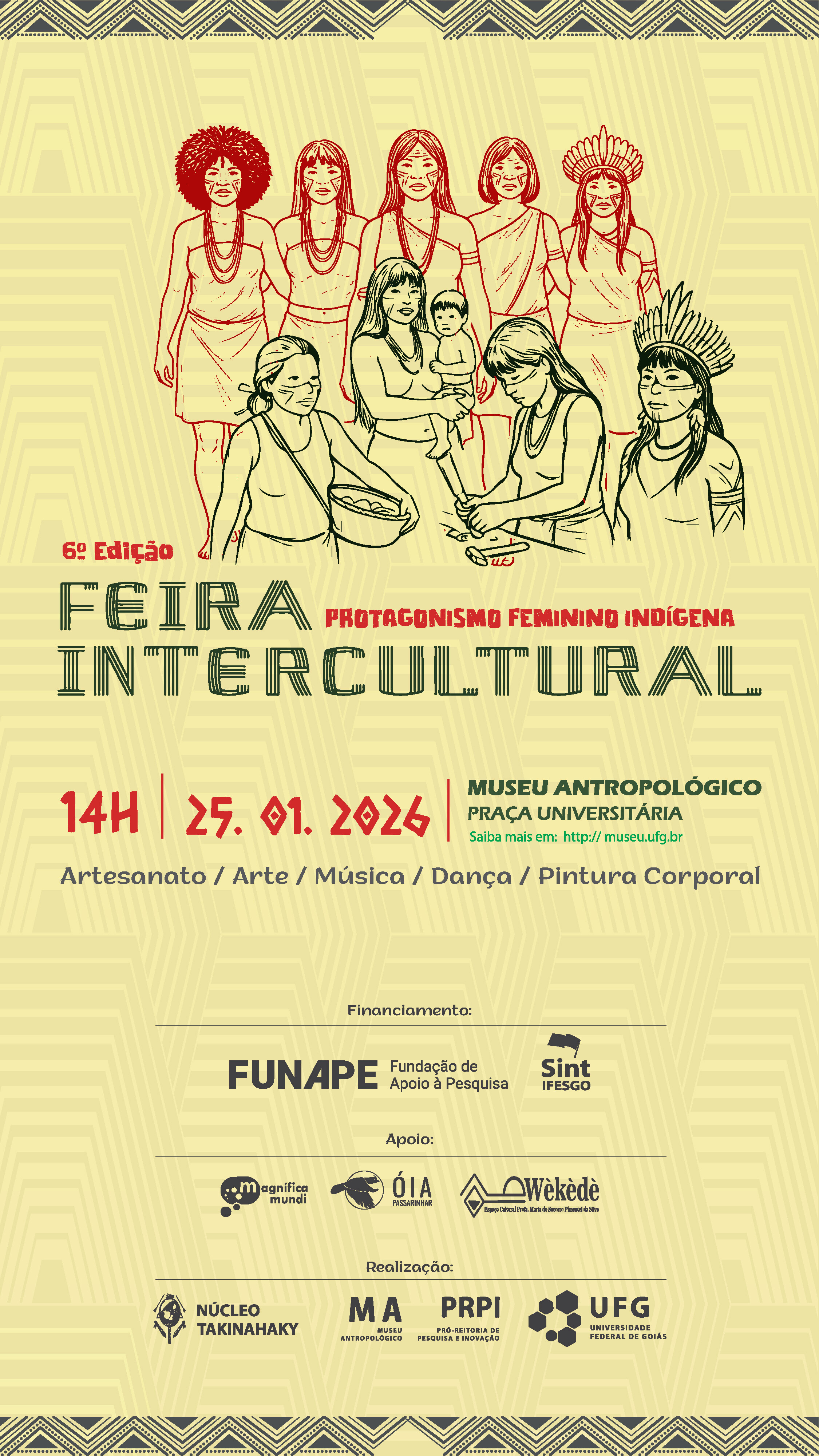 O Museu Antropológico da Universidade Federal de Goiás (UFG), em parceria com o Instituto Takinahakỹ de Formação Superior Indígena, realiza no próximo dia 25 de janeiro (domingo), das 14h às 18h, a 6ª edição da Feira Intercultural Indígena, com o tema “Mulheres indígenas e protagonismo nas lutas e nas tradições”. O evento acontece no estacionamento do Museu Antropológico (Praça Universitária), com entrada gratuita e programação aberta ao público.