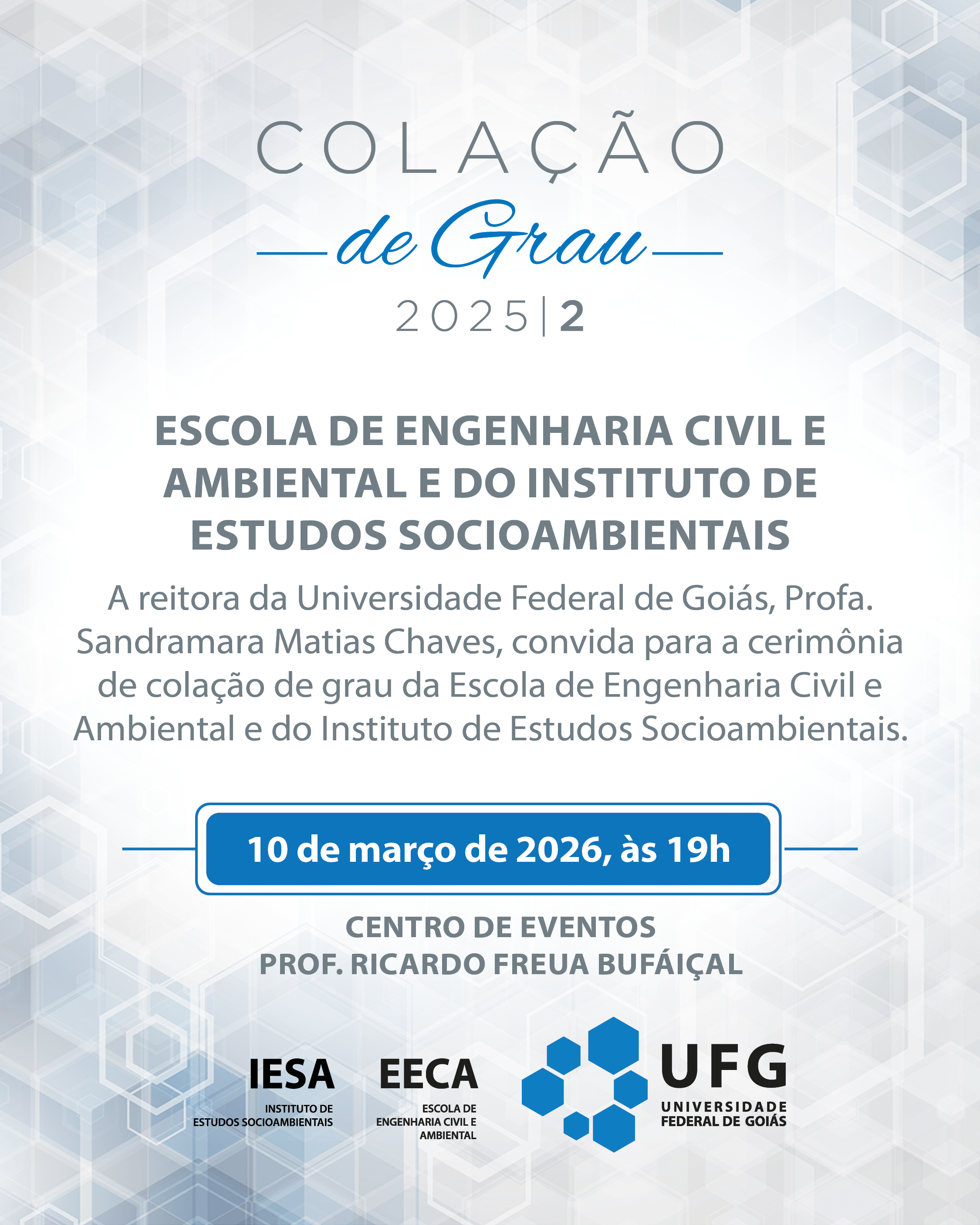 Colação de grau 2025/2: EECA e IESA Evento Local: Centro de Eventos Prof. Ricardo Freua Bufáiçal, Câmpus Samambaia Data do Evento : 10 de Março 2026 às 19:00 TweetWhatsApp Listar Todas Voltar