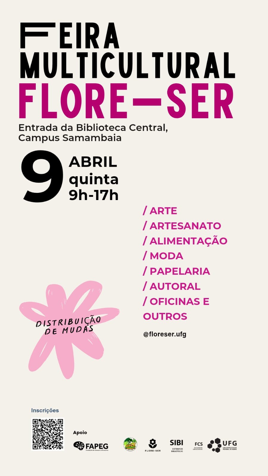 Caso seja possível, pedimos apoio na divulgação por meio dos canais institucionais (e-mail, jornal, redes sociais). Envio em anexo a arte do evento e abaixo o link de nossa página no Instagram, onde podem ser obtidas mais informações: https://www.instagram.com/floreser.ufg/.