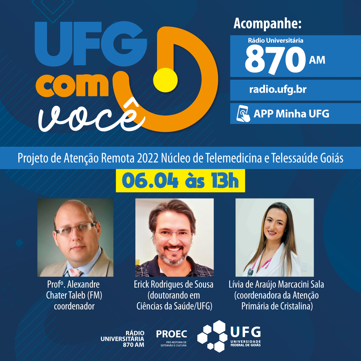 UFG com Você: "Projeto de atenção remota 2022 Núcleo de Telemedicina e Telessaúde Goiás" Événement Local: Rádio Universitária - 870 AM, radio.ufg.br e App Minha UFG Date de l'événement : 06 Abril 2022 às 13:00 TweetWhatsApp Liste tous Voltar