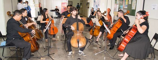 Um sarau mudou a rotina no prédio da Reitoria da Universidade Federal de Goiás (UFG) no fim da tarde desta quinta-feira (7/12). O hall de entrada abriu espaço para professores e estudantes da Escola de Música e Artes Cênicas (Emac) que compõem o Grupo de Violoncellos da UFG e a Camarata de Cordas Jean Doulliez, dirigidos pelos professores Luciano Pontes e David Gardner. David Castello também participou como professor convidado.