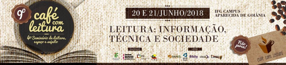 O IX Café com Leitura e o IV Seminário de Leitura, Espaço e Sujeito serão realizados nos dias 20 e 21/6 no câmpus Aparecida de Goiânia do Instituto Federal de Goiás (IFG). Interessados podem acessar o edital completo neste link. Outras informações podem ser encontradas na página do evento: www.cafecomleitura.fic.ufg.br