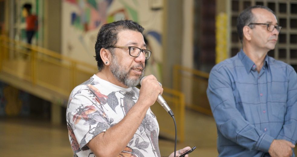 “Os docentes adoecem em meio aos silêncios que existem na universidade”. Assim o Professor Alex Ratts, do Laboratório de Estudos de Gênero, Étnico-raciais e Espacialidades da UFG (LaGENTE), iniciou a fala na roda de conversa que integrou as atividades da Semana das Trabalhadoras e dos Trabalhadores, promovida pelo Departamento de Desenvolvimento de Recursos Humanos da UFG (DDRH), em parceria com o Sindicato dos Trabalhadores Técnico-administrativos das Instituições Federais de Ensino Superior do Estado de Goiás (SINT-Ifesgo). Realizado em espaços abertos da universidade, o evento tem o objetivo de promover debates sobre o trabalho na instituição. “Ao invés de estarmos em uma sala fechada, abrimos espaço para uma roda de conversa sobre conscientização”, afirmou a diretora do DDRH, Rosângela Nunes de Almeida Castro.