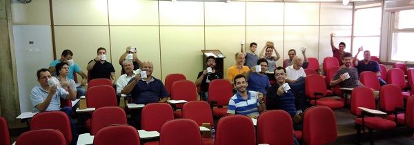 Servidores do Instituto de Física exibem suas canecas, que fazem parte da campanha de conscientização