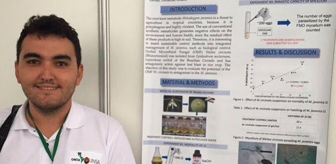 O estudante Bruno Leonardo Mendes, do mestrado em agronomia da Universidade Federal de Goiás (UFG), foi premiado em um congresso internacional. A pesquisa dele, intitulada “Orchid Mycorrhizal Fungi control Meloidogyne javanica in vitro”, foi selecionada pela Organization of Nematologists of Tropical America no Brazilian Travel Award. Bruno recebeu mil dólares para ajudar nos custos da viagem para o Congresso Internacional ONTA 2018, em Arequipa, Peru.