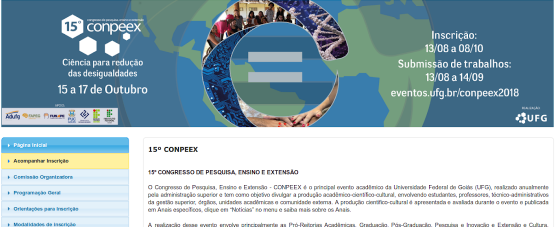 Atendendo solicitação da Pró-Reitoria de Extensão e Cultura (PROEC), a Secretaria de Tecnologia e Informação (SeTI), por meio do Centro de Recursos Computacionais (CERCOMP), disponibilizou nova funcionalidade do sistema SIEC Eventos, a qual já está sendo utilizada para as inscrições do Conpeex 2018. A partir de agora, por meio do menu "Acompanhar Inscrição", o participante inscrito em algum evento da UFG poderá acompanhar a situação da sua inscrição, alterar os dados pessoais, se inscrever em outras modalidades do evento, visualizar os códigos (QR Code) das inscrições realizadas e acompanhar os registros das frequências nas atividades durante a realização do evento.