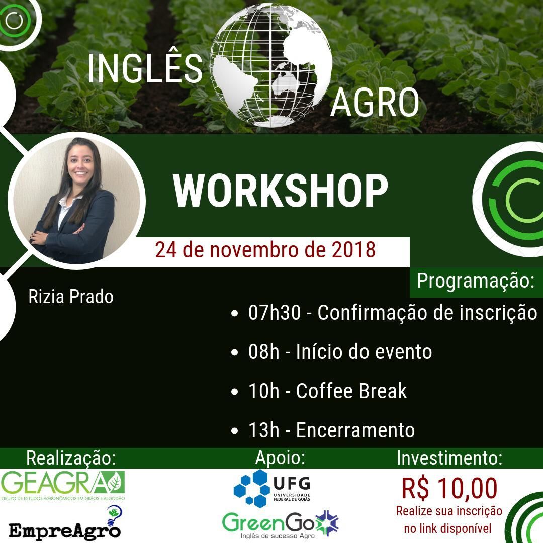 O workshop será ministrado pela professora será Rizia Prado, especialista no assunto e dona da famosa página GreenGo Inglês do Instagram. O evento vai ocorrer no dia 24/11, no auditório Roland Vencovsky (Prédio de Melhoramento - Escola de Agronomia - UFG), às 07h30. O custo do investimento é R$10,00. O valor da inscrição pode ser passado para qualquer membro GEAGRA na UFG. Interessados podem se inscrever no link bit.ly/2Ot4egT.