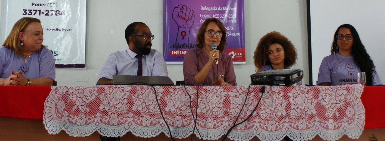 Na mesa, participaram, a advogada do Centro Especializado de Atendimento à Mulher (CEAM), Synara Baía, e a coordenadora da Ouvidoria da UFG, Denize Ribeiro, que apresentou dados sobre as denúncias feitas e esclareceu sobre o papel do órgão na UFG e quais os caminhos para denunciar os casos. A autoridade mais esperada no evento foi a professora Sandramara Matias Chaves, que voltou para a mesa à noite e discorreu sobre as formas de enfrentamento eficazes.. Falou da Comissão de Combate ao Assédio Sexual, Moral e Preconceito, cujo papel é de acompanhamento dos processos e que trabalharia com a prevenção dos casos junto à comunidade universitária.