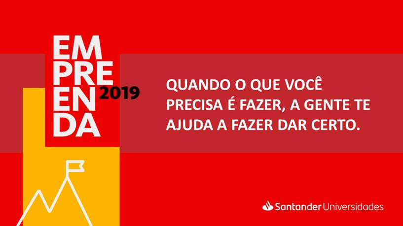 Estão abertas as inscrições para o Empreenda Santander 2019. A iniciativa tem como objetivo apoiar o empreendedorismo em todo Brasil, em três categorias: Universitário Empreendedor, Startup e Universidade & Microempreendedor. O Santander Universidades apoiará com aporte financeiro, bolsas de estudos na Babson College e mentoria. Clique aqui para mais informações.