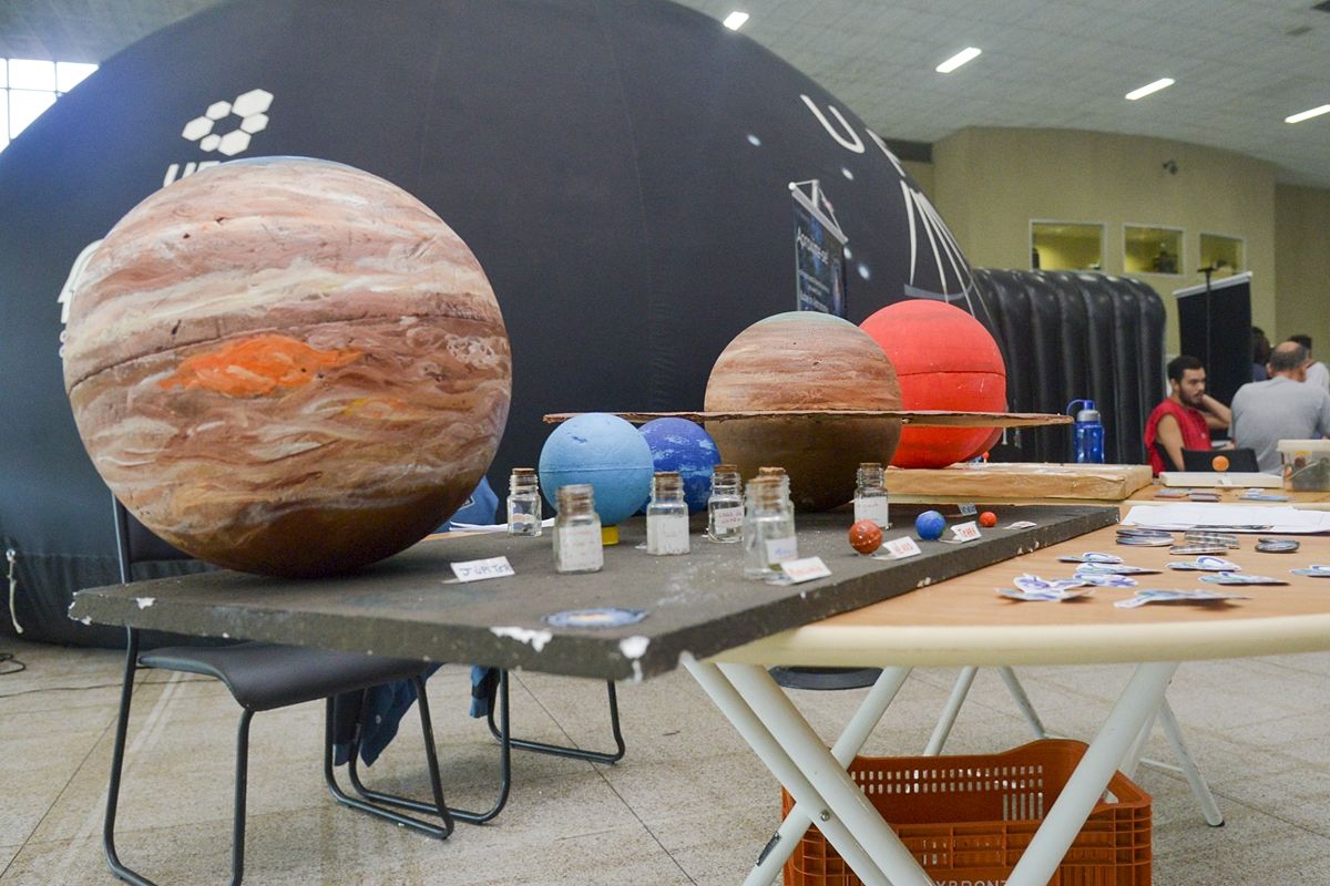 Ao entrar no Centro de Eventos, os visitantes se deparavam com um domo inflável do Planetário da UFG. Dentro dele era feita uma projeção full dome, em que imagens são projetadas em toda a circunferência do domo, o que garante uma imersão total de quem está lá dentro. A fila estava comprida durante a tarde, e quem participou pôde acompanhar um passeio pelo universo.