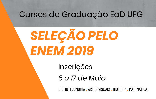 A seleção para os cursos de graduação a distância da UFG será realizada exclusivamente pelo Enem. As inscrições para o Enem 2019 devem ser realizadas entre 6 e 17 de maio, exclusivamente pelo site do exame. Um edital do processo seletivo para a EaD deve ser lançado no final de 2019, detalhando a composição da nota final para concorrência a uma das vagas de EaD da UFG, dentre outras informações.