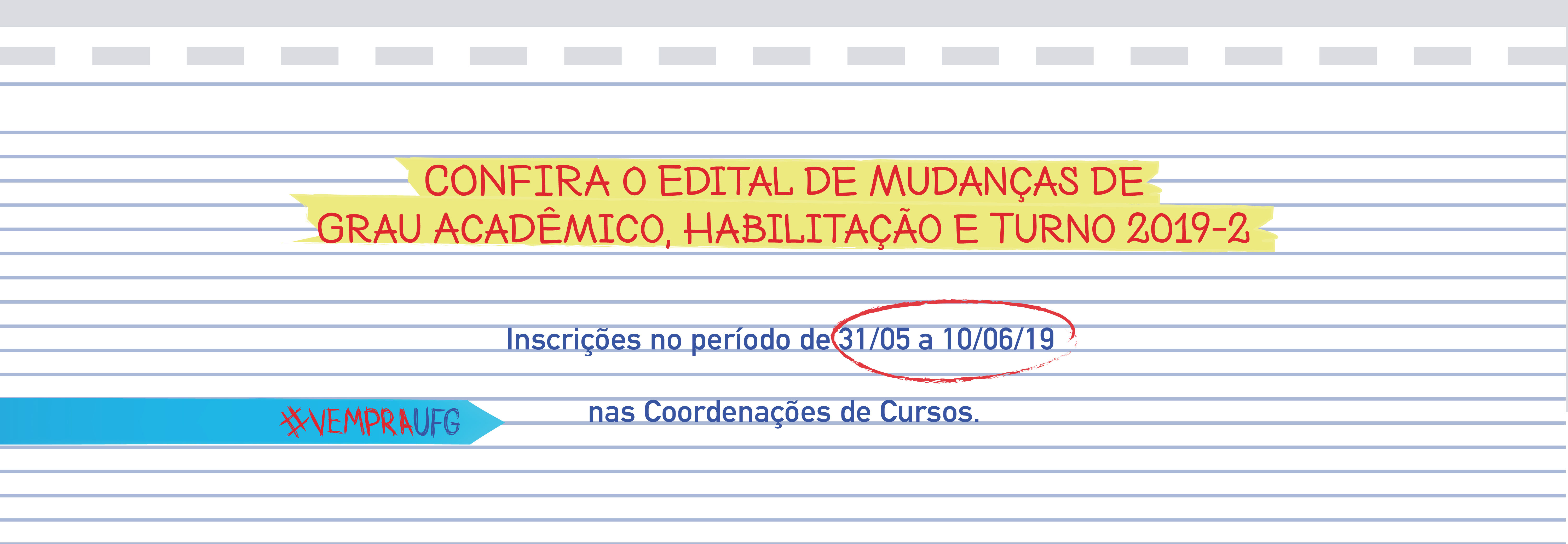 A Pró-reitoria de Graduação (Prograd) e o Centro de Gestão Acadêmico (CGA) informam que está aberto o prazo para a inscrição no edital do processo seletivo para Mudanças de Grau Acadêmico, Habilitação e Turno nos cursos de graduação presenciais da UFG, para o segundo semestre do ano letivo de 2019. O prazo para inscrição segue aberto até o dia 10 de junho.