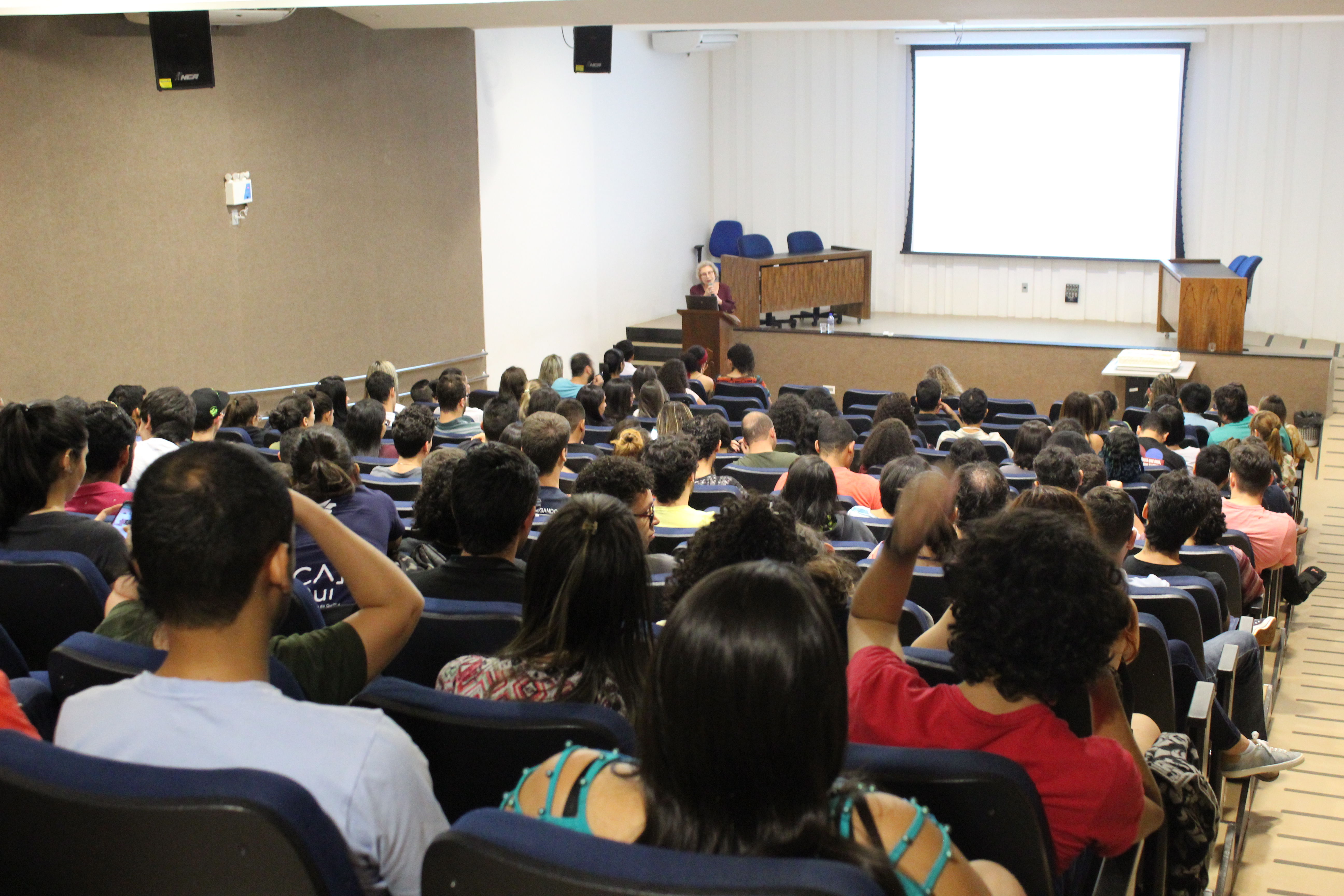 A professora Agustina Echeverría ministrou uma palestra sobre a trajetória da tabela periódica até os dias atuais
