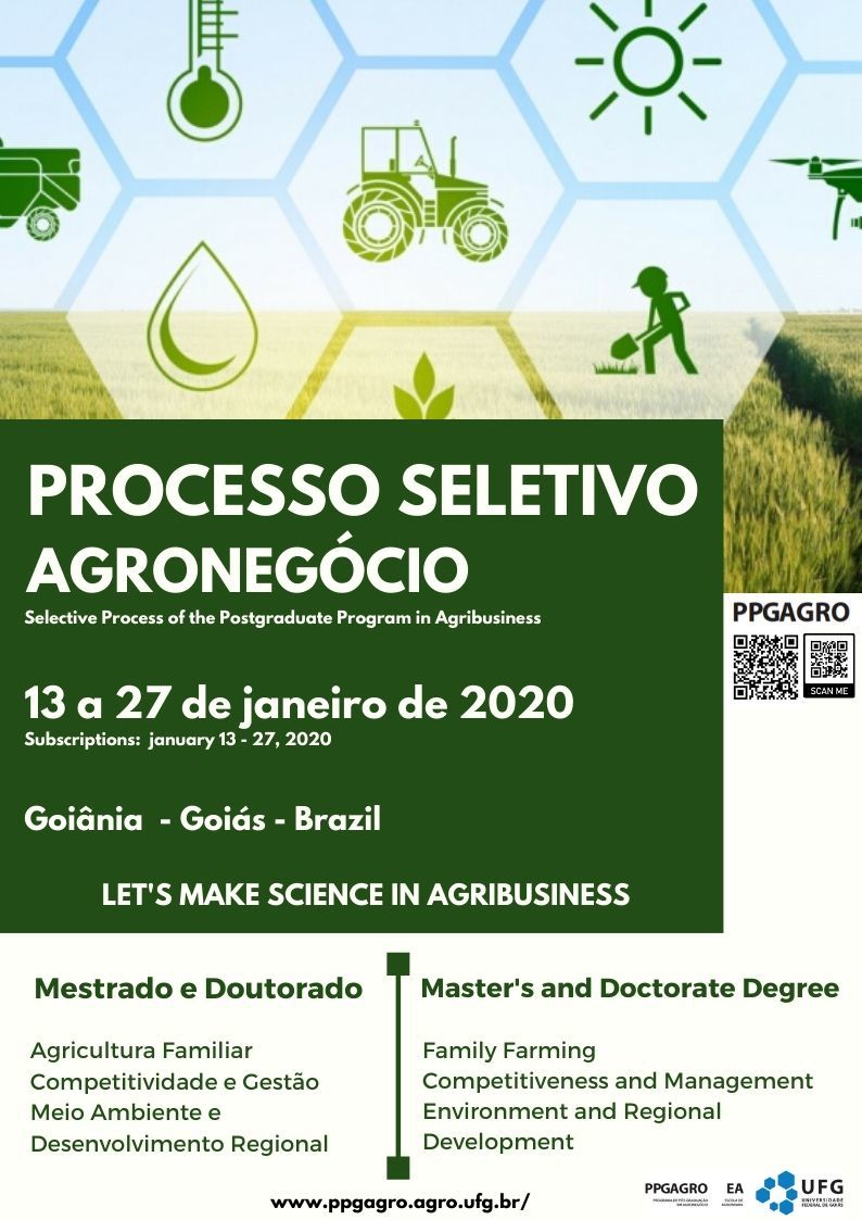 O Programa de Pós-graduação em Agronegócio da UFG (PPGAGRO) publicou o edital do processo seletivo para mestrado e doutorado. Clique aqui para acessar o documento.