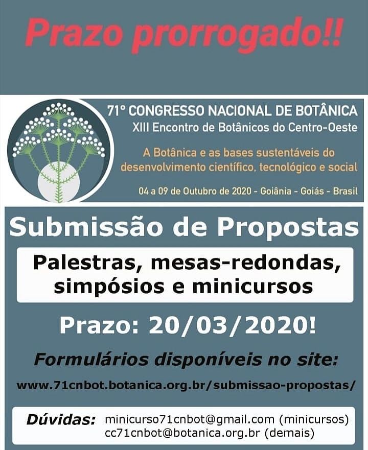 71º Congresso Nacional de Botânica recebe propostas para programação On 02/28/20 11:45 . Inscrições até 20 de março Source: Secom UFG Categories: Editais ICB TweetWhatsApp List all Back