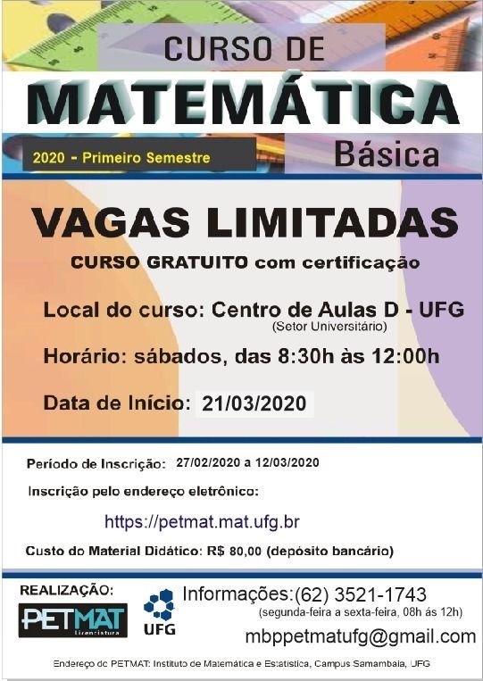 A equipe executora do Projeto Matemática Básica em Perspectiva do Programa de Educação Tutorial do Curso de Matemática, do Instituto de Matemática e Estatísticas da Universidade Federal de Goiás (Petmat/IME/UFG), divulga um curso de Matemática Básica destinado às pessoas que possuem dificuldades nesta disciplina.