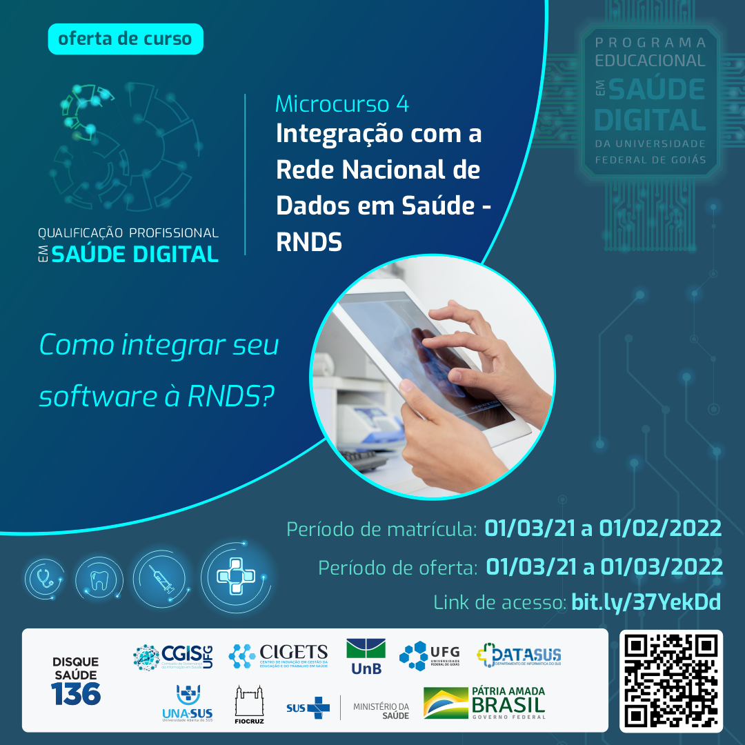 Estão abertas as inscrições para o Microcurso 4: Integração com a Rede Nacional de Dados em Saúde, que visa contribuir com a formação de integradores aptos a desenvolver software para conexão com a RNDS, um software que permita a troca (envio e recebimento) de informação em saúde com a Rede Nacional de Dados em Saúde (RNDS).