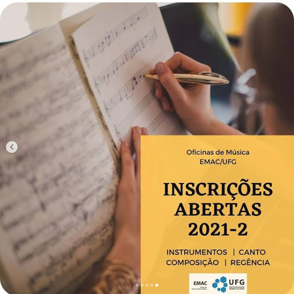 Estude nas Oficinas de Música da Universidade Federal de Goiás. Devido à pandemia do novo coronavírus, as aulas são ministradas de modo 100% remoto. Podem se inscrever pessoas de todo o Brasil. Há 15 cursos para Iniciantes, Amadores, Vestibulandos, Estudantes de Graduação e Profissionais.