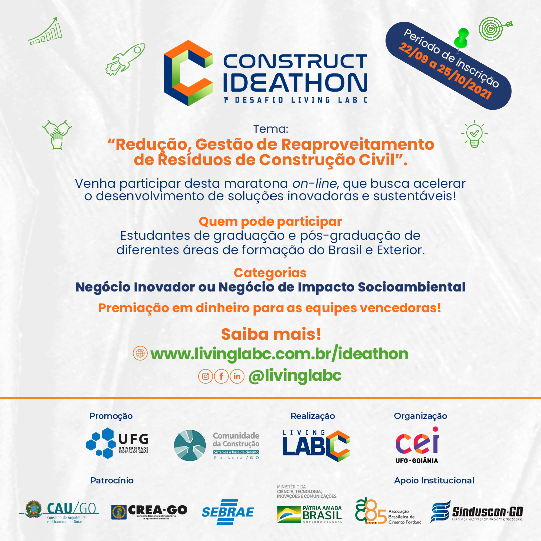 O Desafio de âmbito nacional e 100% on-line é promovido pela Universidade Federal de Goiás (UFG) e pelo Programa Comunidade da Construção (polo goiano), realizado pelo Living Lab C, o primeiro laboratório vivo no Centro-Oeste focado em inovação e sustentabilidade na construção civil, com a organização do Centro de Empreendedorismo e Incubação (CEI) da UFG. Além do apoio do Ministério da Ciência, Tecnologia e Inovações (MCTI), da Associação Brasileira de Cimento Portland (ABCP) e do Sindicato da Indústria da Construção no Estado de Goiás (Sinduscon-GO), o Construct Ideathon conta com o patrocínio do Conselho de Arquitetura e Urbanismo de Goiás (CAU-GO), do Conselho Regional de Engenharia e Agronomia de Goiás (Crea-GO) e do Serviço Brasileiro de Apoio às Micro e Pequenas Empresas em Goiás (Sebrae/GO).