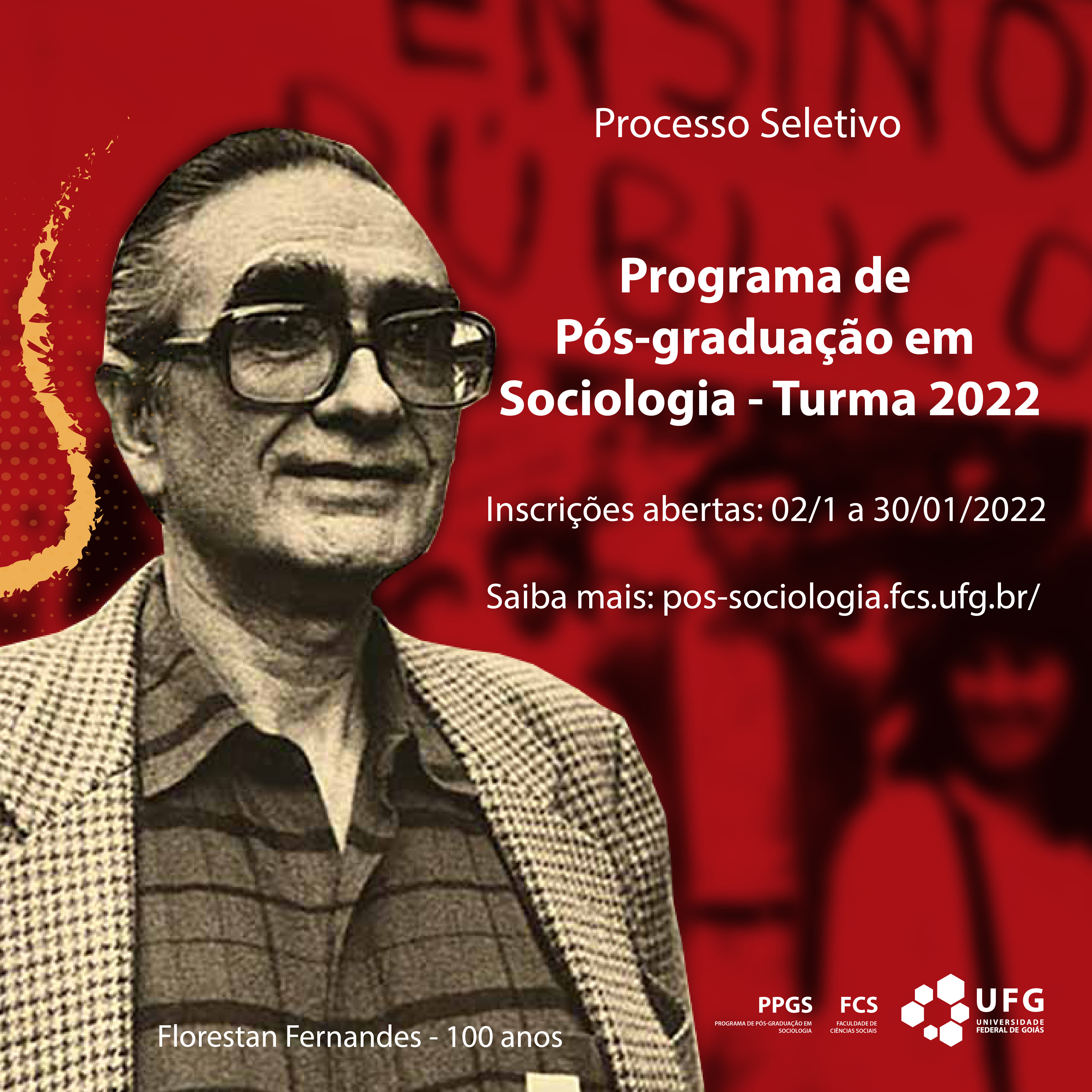 A Coordenadoria do Programa de Pós-Graduação em Sociologia (PPGS), da Faculdade de Ciências Sociais (FCS), da Universidade Federal de Goiás (UFG), torna público aos interessados que se encontram abertas as inscrições ao Mestrado em Sociologia, no período de 02/01/2022 a