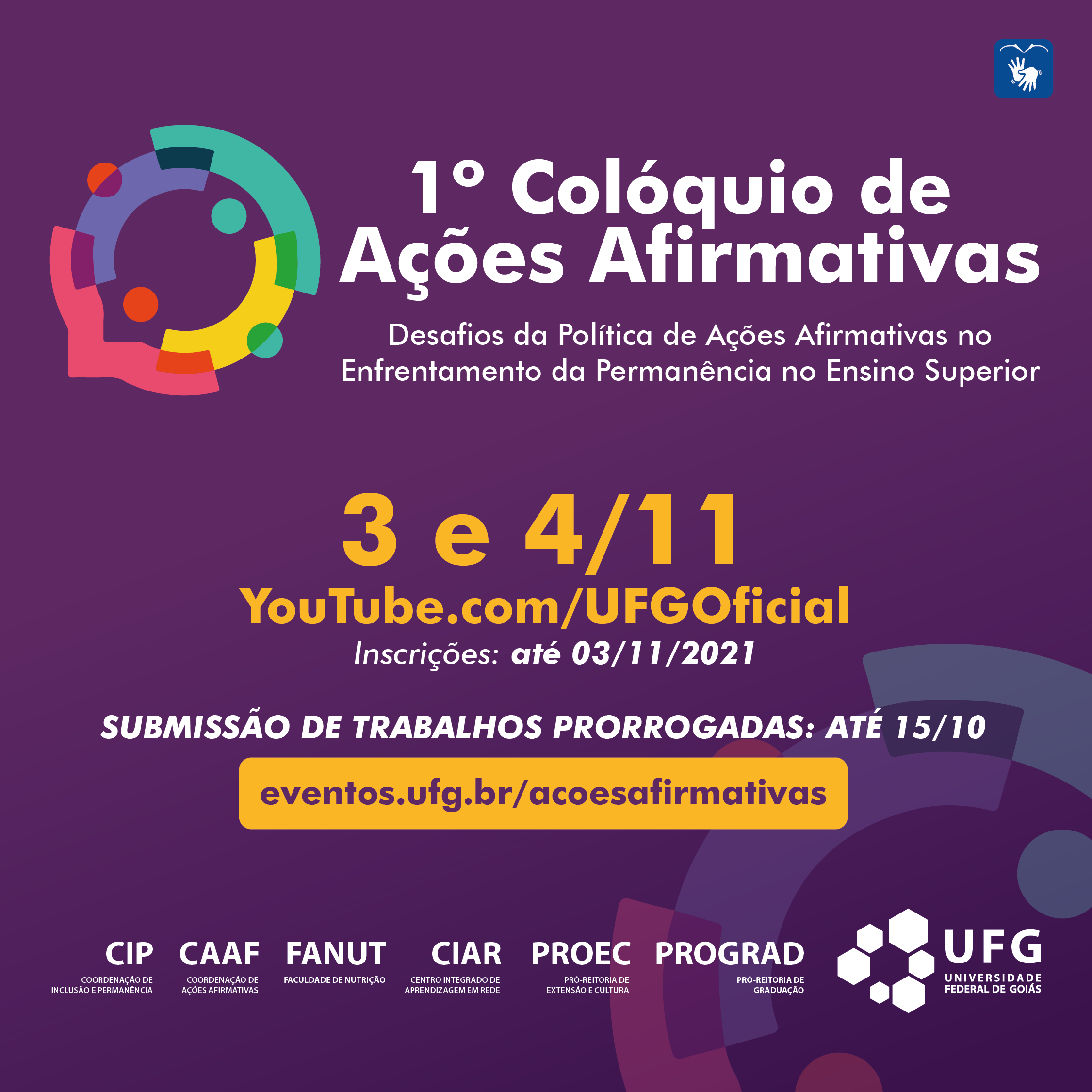Esse evento é gratuito e apresenta como objetivos discutir os impactos das experiências nacionais na consolidação da Política das Ações Afirmativas; discutir as políticas de permanência dos estudantes ingressos por ações afirmativas no contexto do ensino remoto e frente as dificuldades da pandemia pela covid-19; descrever a importância dos NDE na constituição da gestão das unidades de ensino no que se refere às ações afirmativas; e publicizar as pesquisas sobre as ações afirmativas realizadas pela UFG e demais instituições de ensino superior da região centro-oeste.