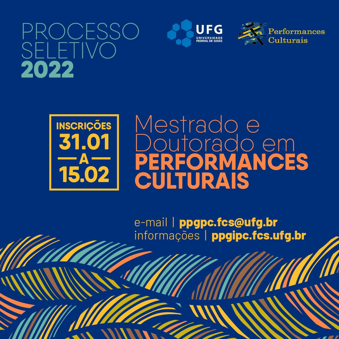 A Coordenadoria do Programa de Pós-Graduação em Performances Culturais (PPGPC), da Faculdade de Ciências Sociais (FCS), da Universidade Federal de Goiás (UFG), torna públicas as normas do Processo Seletivo 001/2022 para o preenchimento de vagas para o primeiro semestre letivo de 2022, nos níveis de mestrado acadêmico e de doutorado.