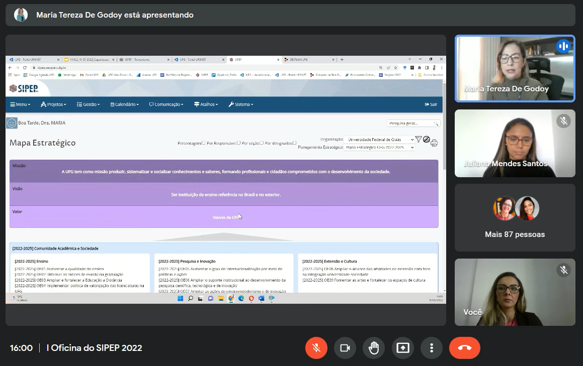 A Secretaria de Planejamento, Avaliação e Informações Institucionais (Secplan/UFG) realizou na quarta-feira (18/5) o primeiro encontro da I Oficina Sipep 2022. No total, serão três encontros, agendados também para os dias 20 e 26 de maio, via Google Meet. Nesta primeira edição da Oficina, participam mais de 100 servidores das pró-reitorias e secretarias da UFG.