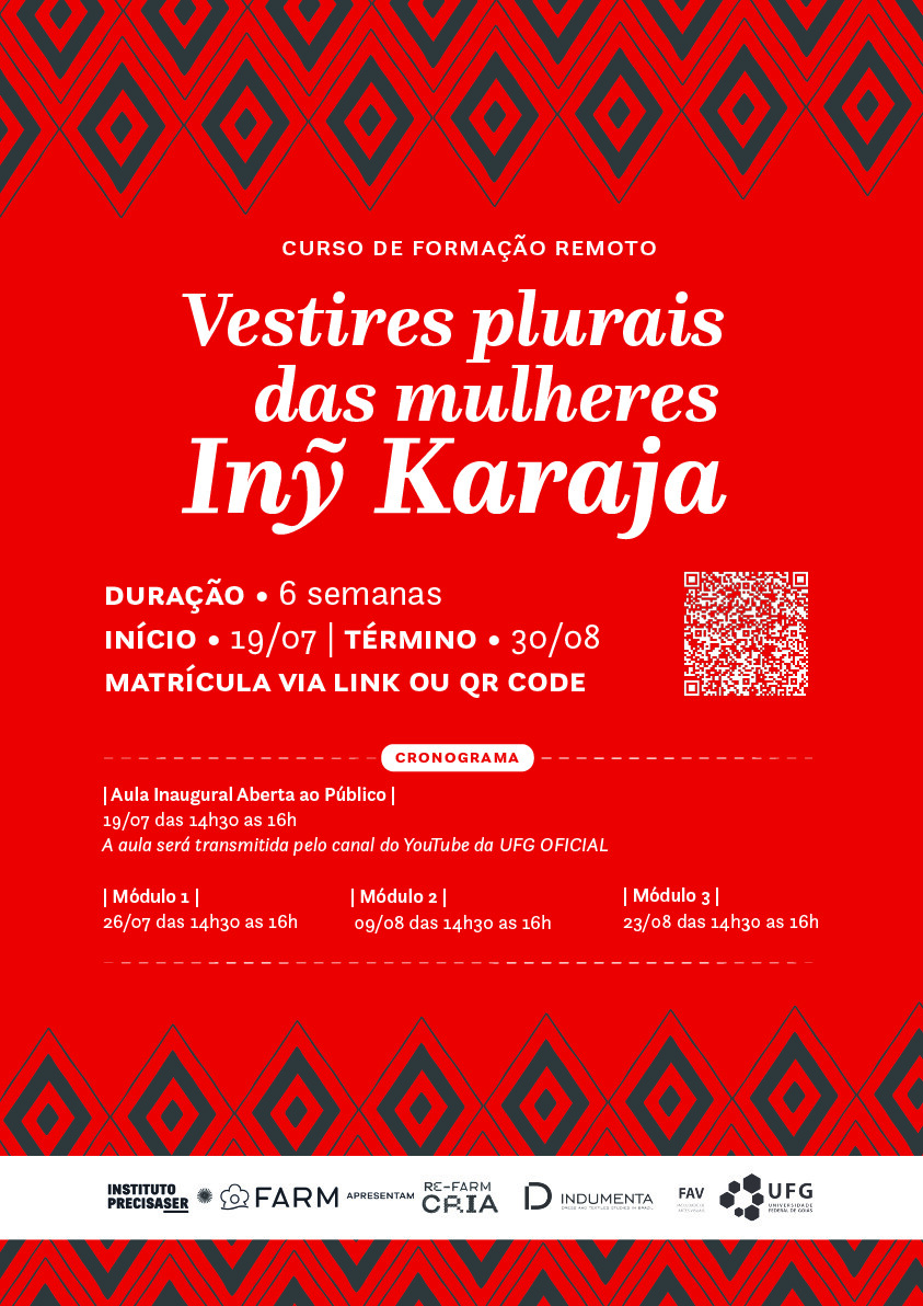O Grupo de Pesquisa INDUMENTA (@indumenta.br), originado na Universidade Federal de Goiás e registrado no CNPq desde 2016, vai ofertar um curso remoto e gratuito chamado “Vestires Plurais das Mulheres Iny Karajá”, a partir do edital de fomento RE-FARM CRIA, uma parceria entre o Instituto Precisa Ser e a marca FARM.